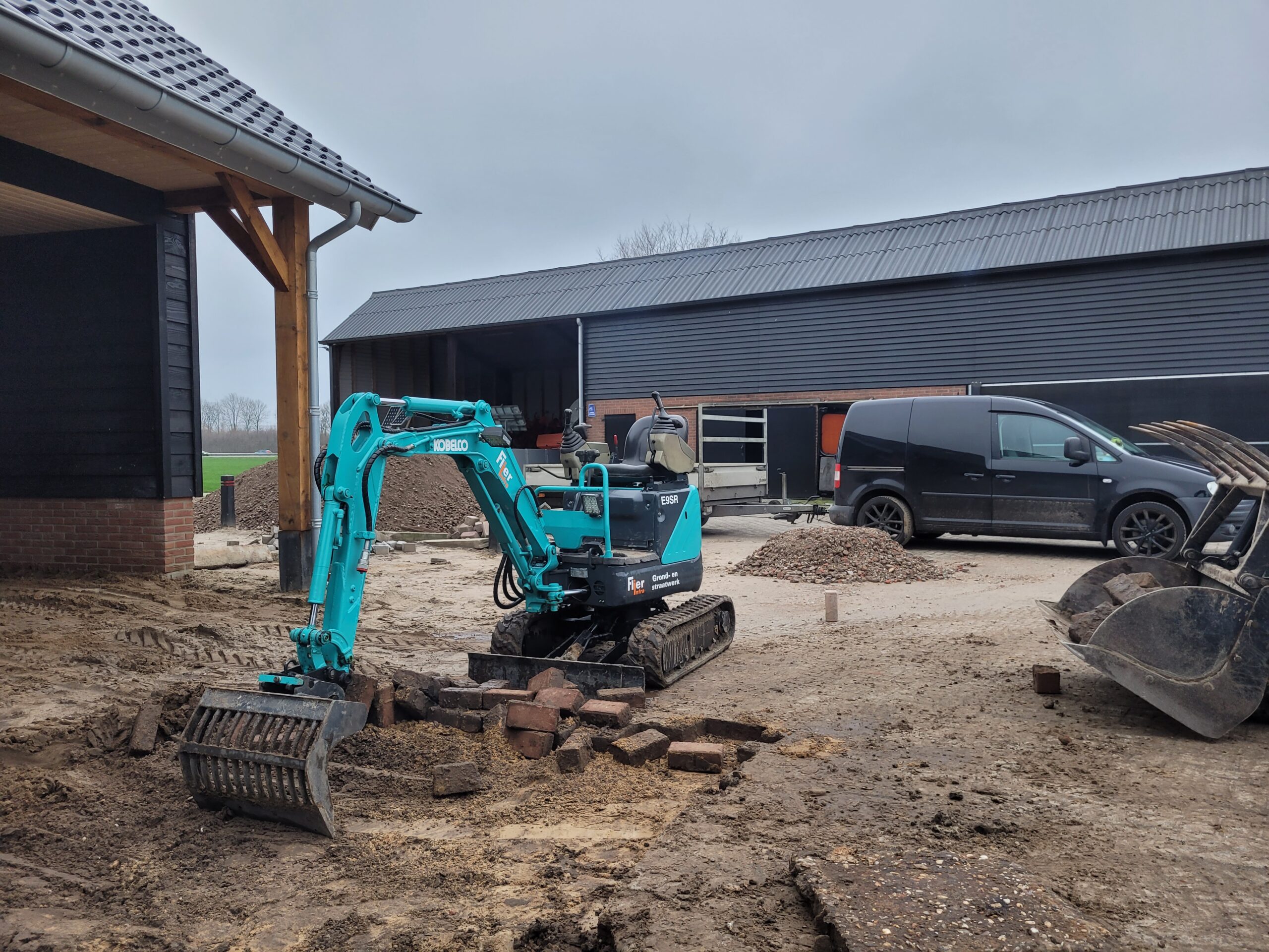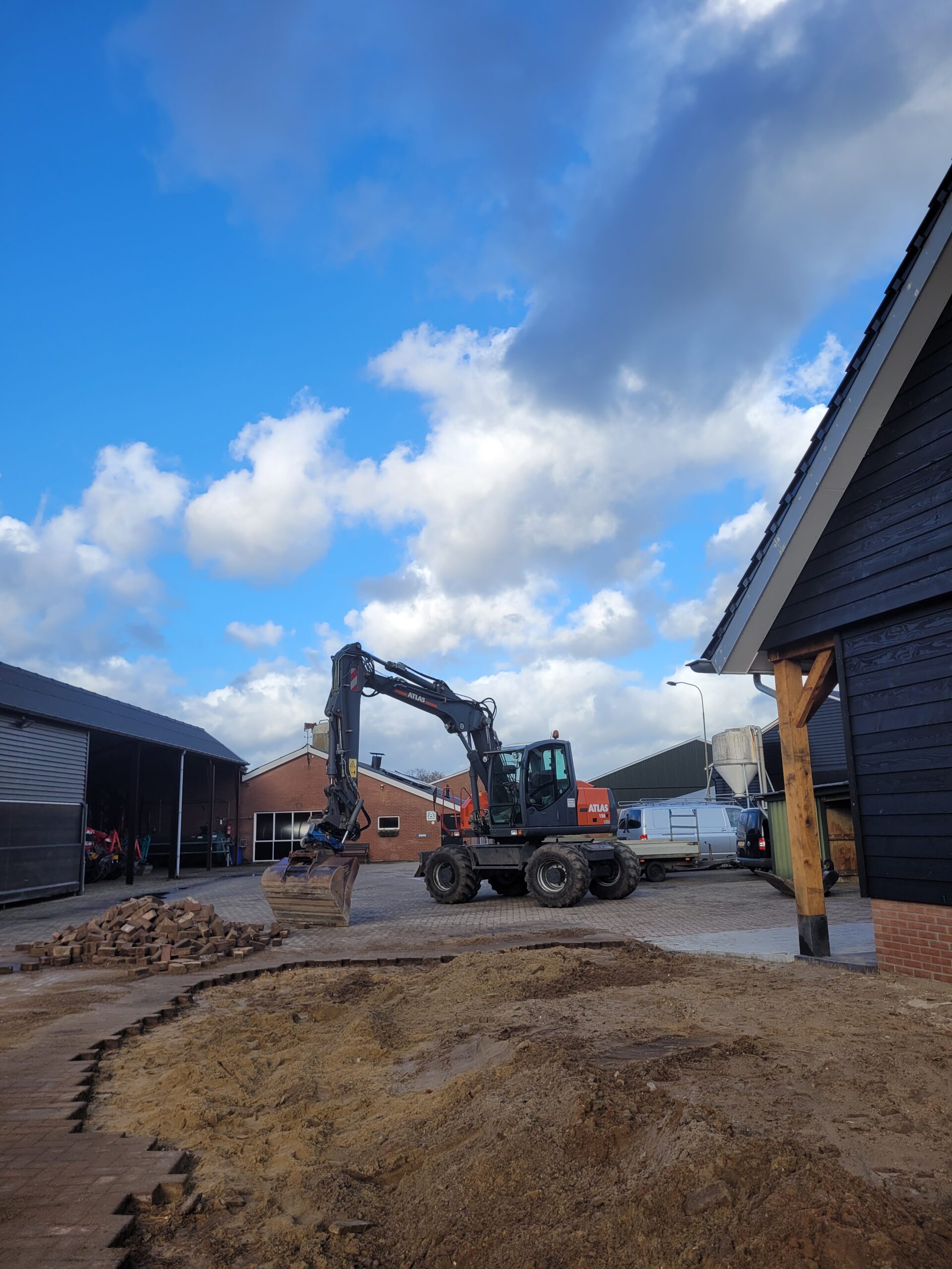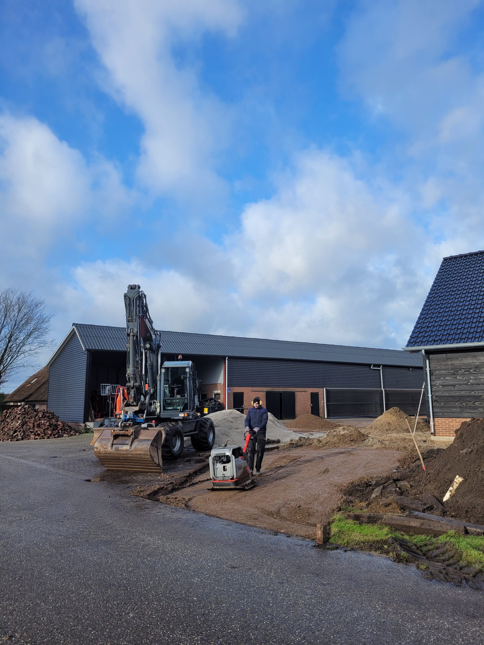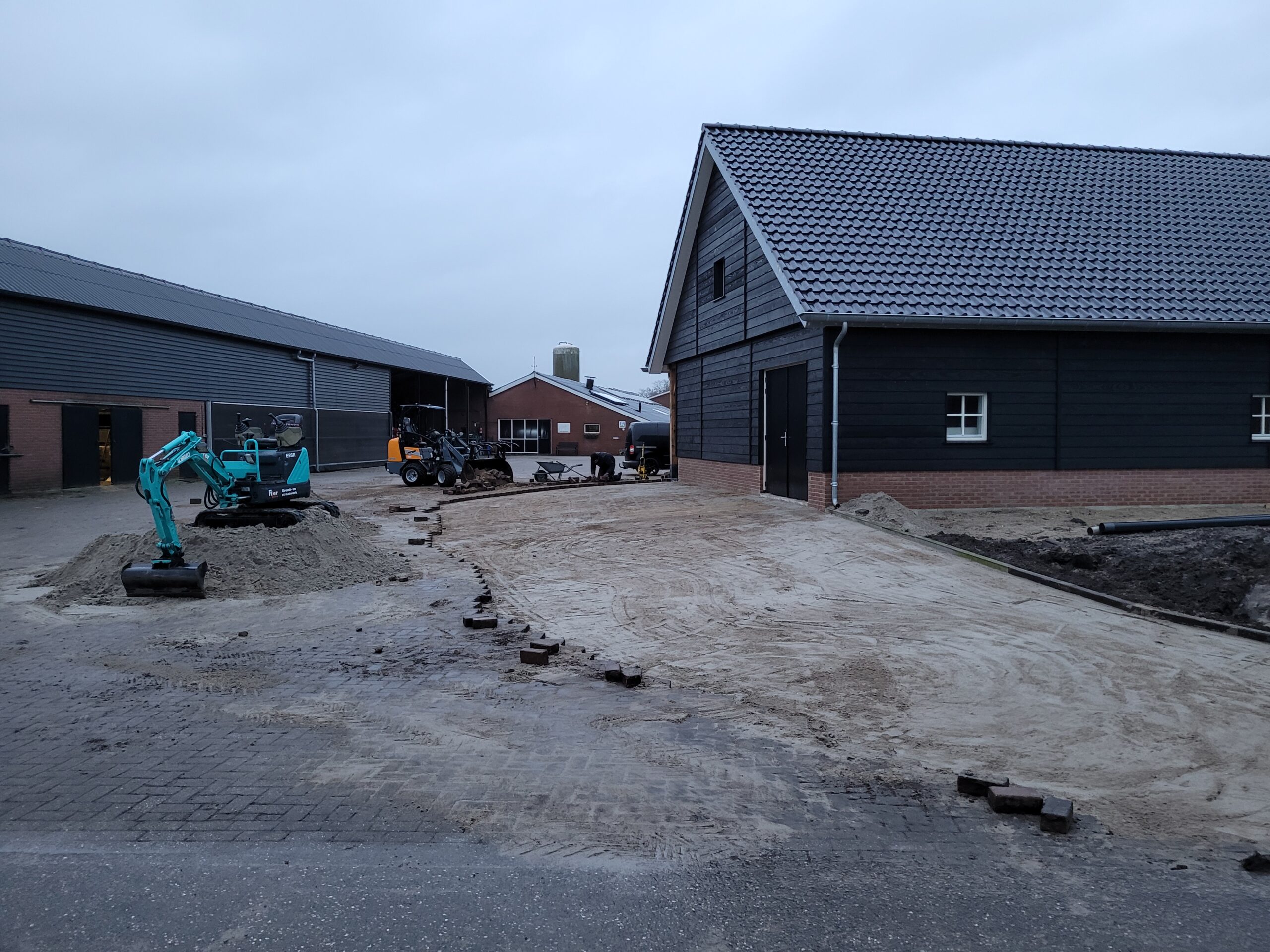 Grondwerk en terreinbestrating rondom een nieuwe schuur op een boeren erf.