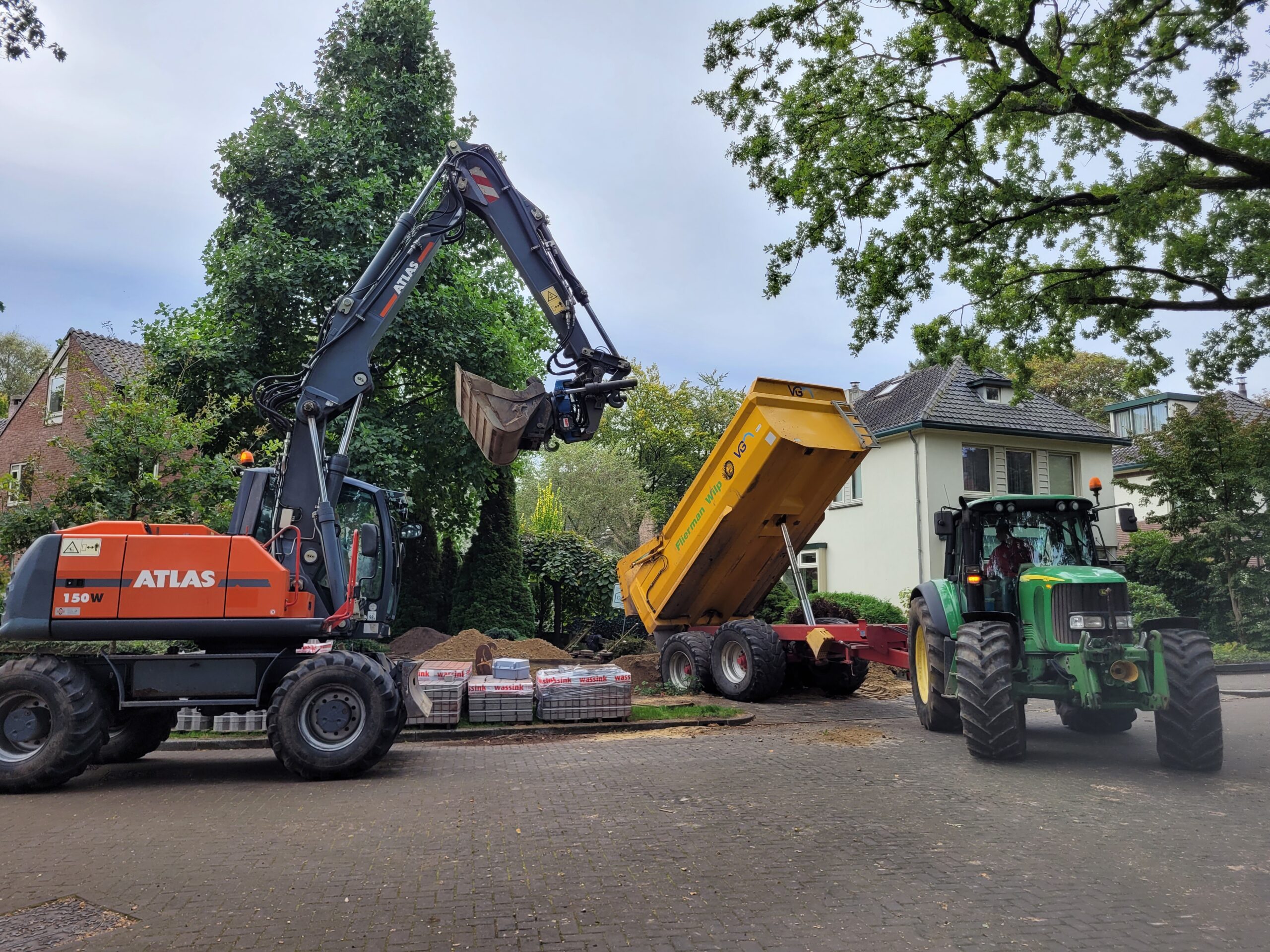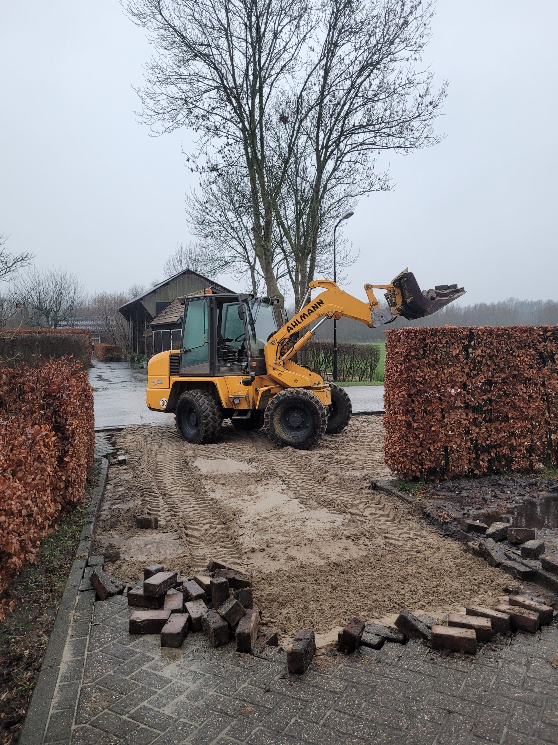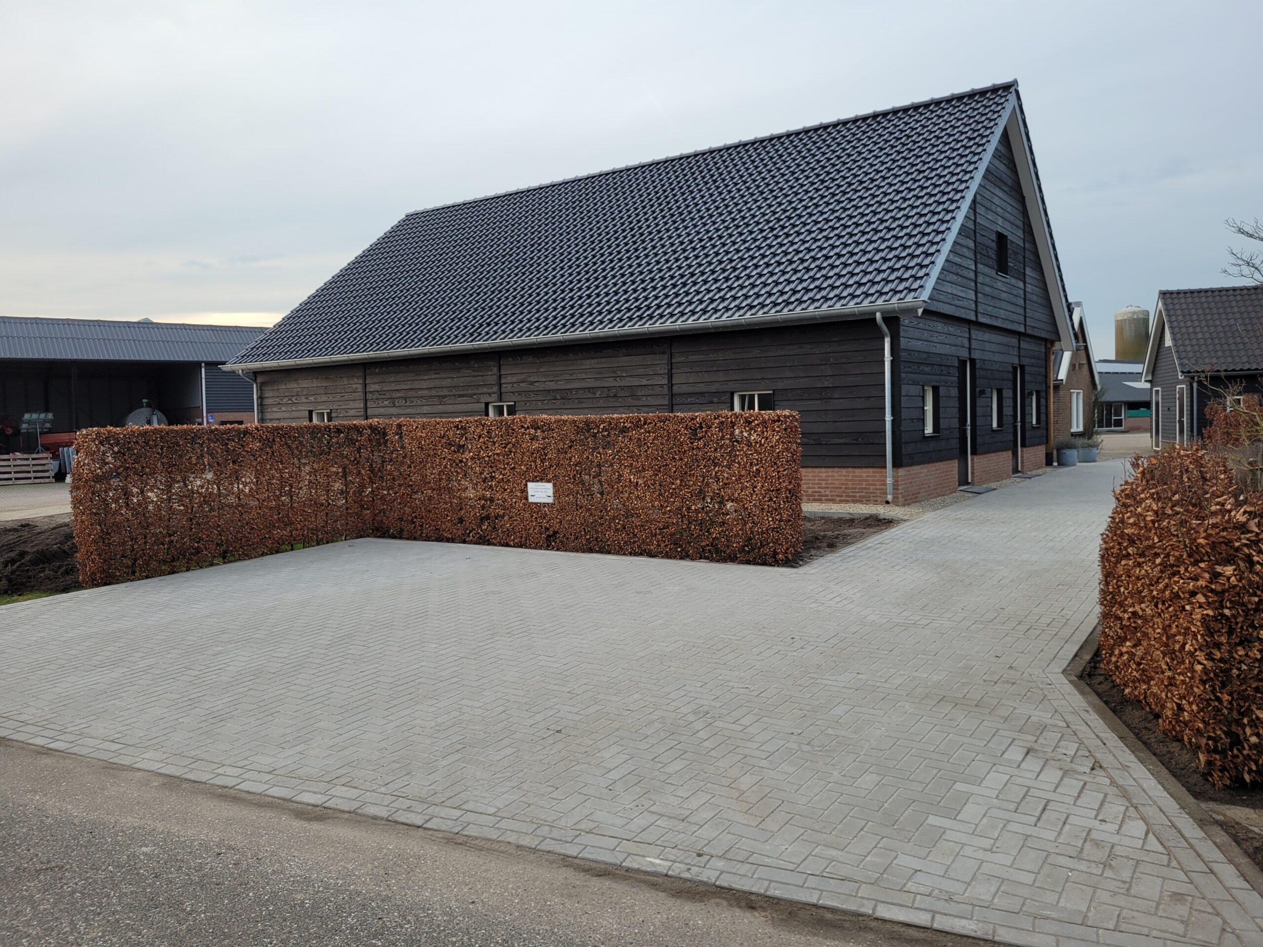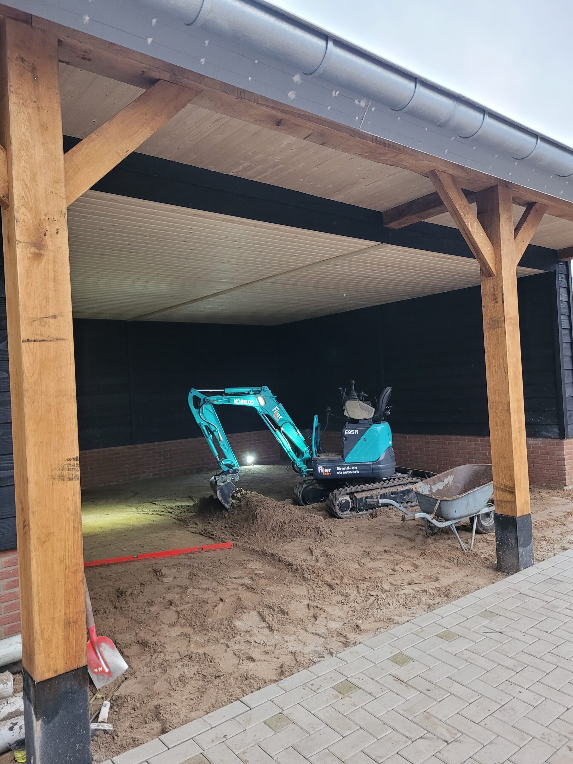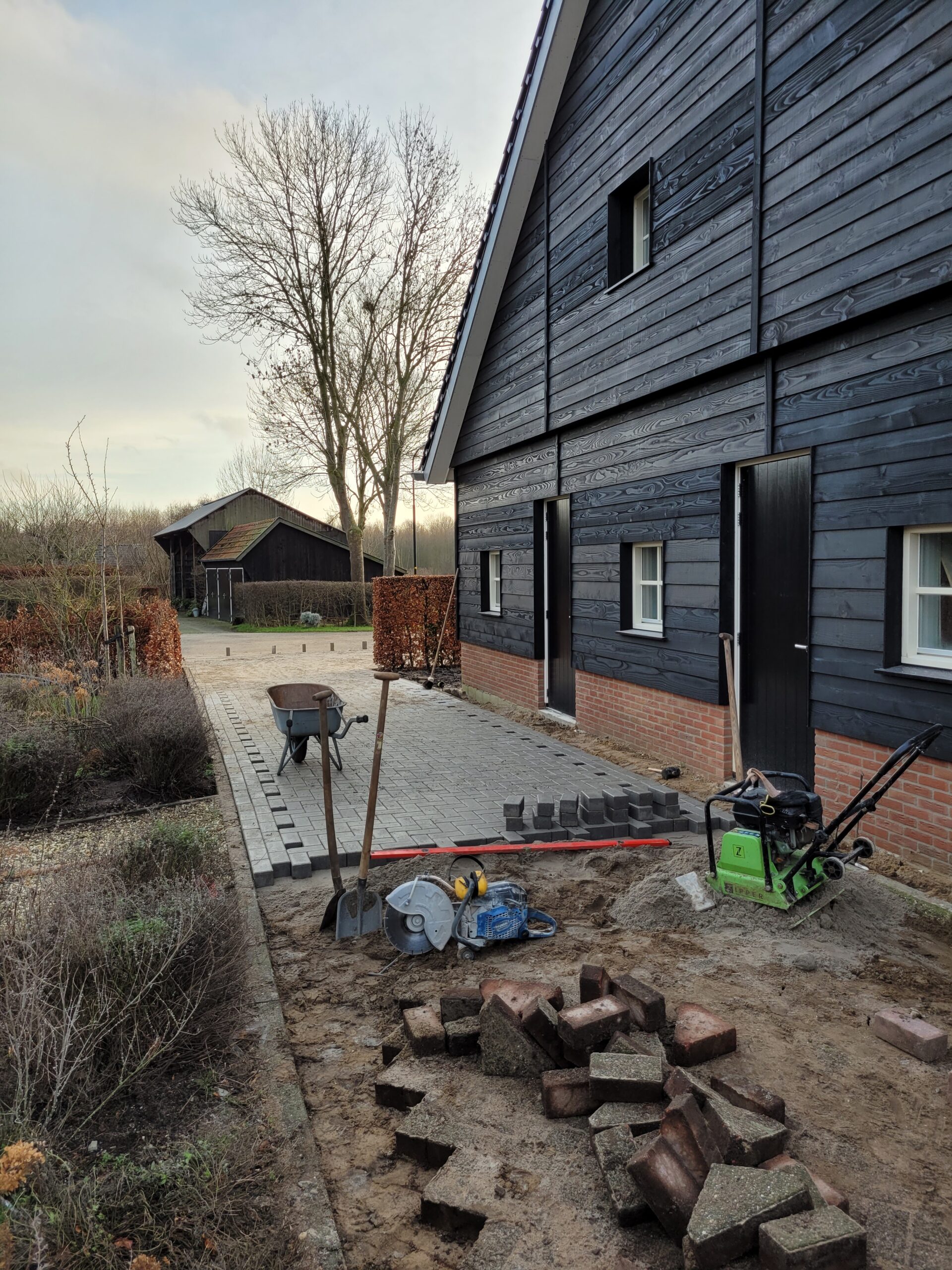 Grondwerk en terreinbestrating rondom een nieuwe schuur op een boeren erf.