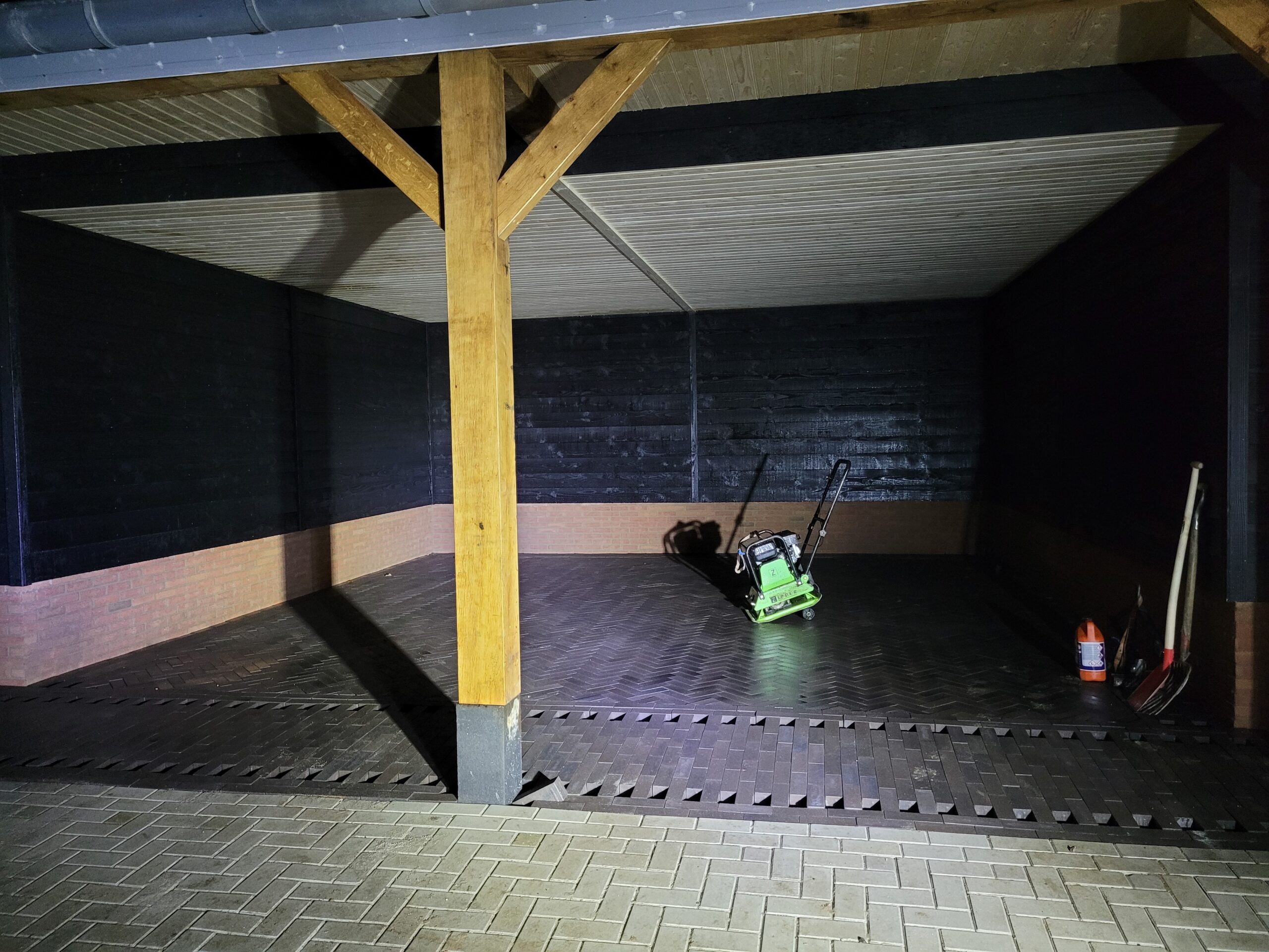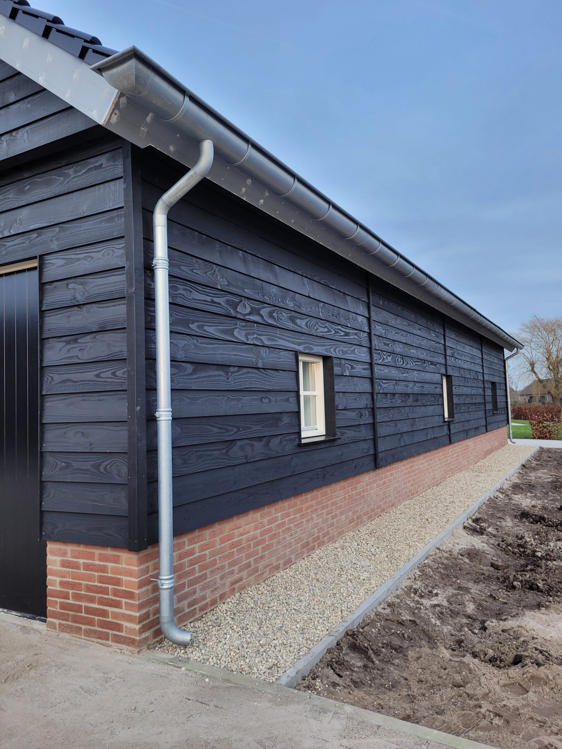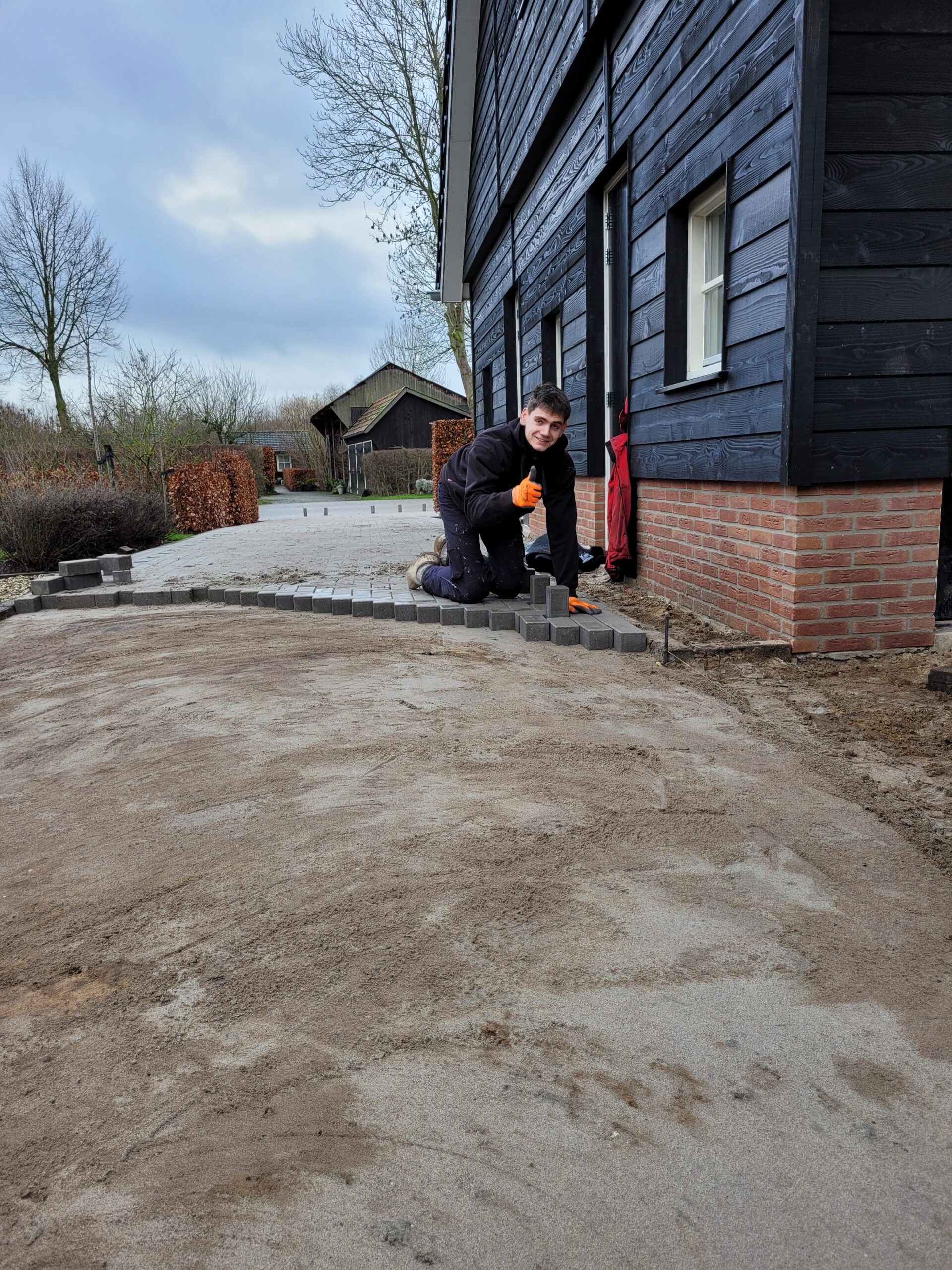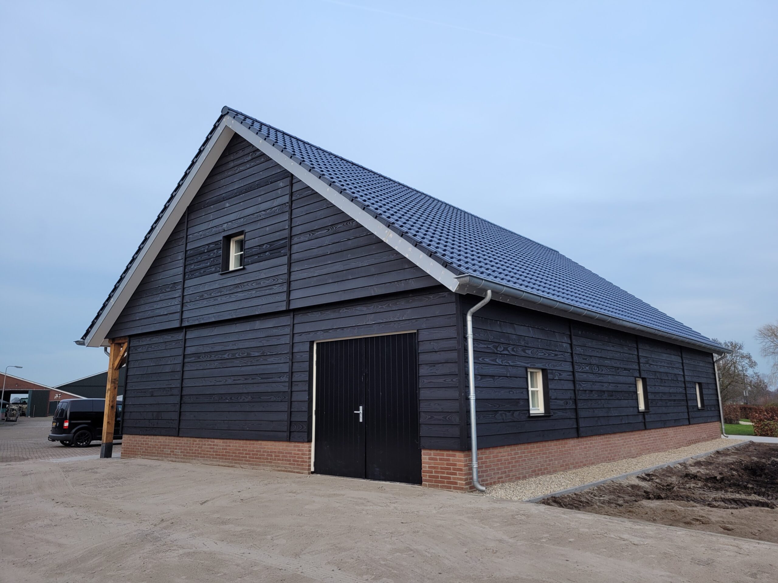 Grondwerk en terreinbestrating rondom een nieuwe schuur op een boeren erf.